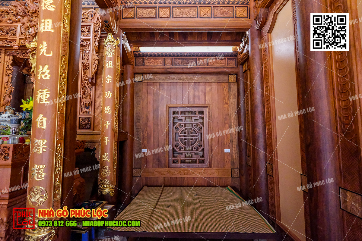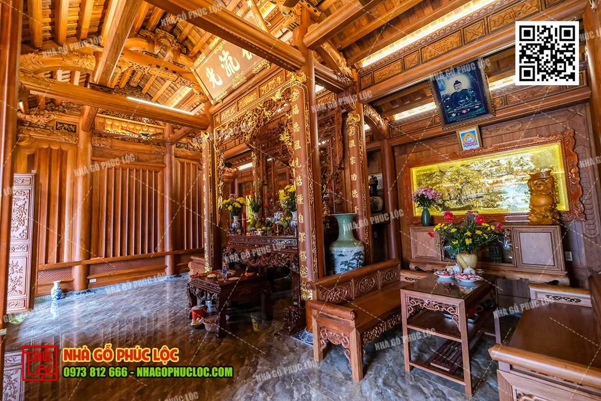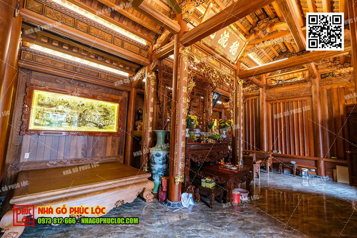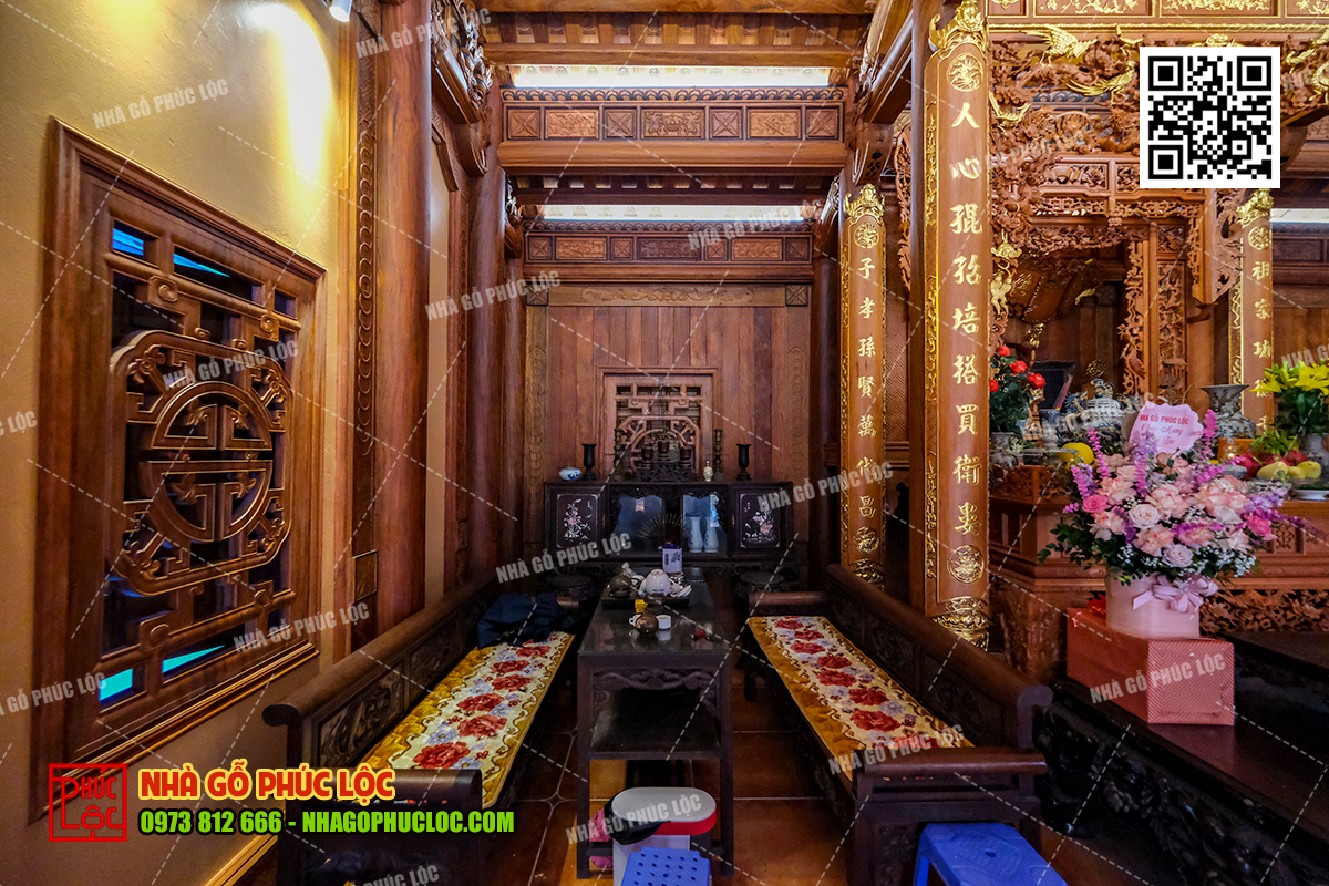 Theo đó, khu vực thờ cúng gia tiên sẽ được bố trí ở gian giữa của nhà gỗ 3 gian. Đây là không gian trang trọng nhất, thể hiện lòng tôn kính và sự hiếu thảo của con cháu đối với tổ tiên. Trong không gian này, có bố trí cửa võng, cuốn thư, câu đối, án gian. Ngoài ra, nội thất nhà gỗ 3 gian có thể thêm các vật phẩm như: lộc bình, hạc chầu đỉnh đồng,… tùy thuộc vào mong muốn của gia chủ..
