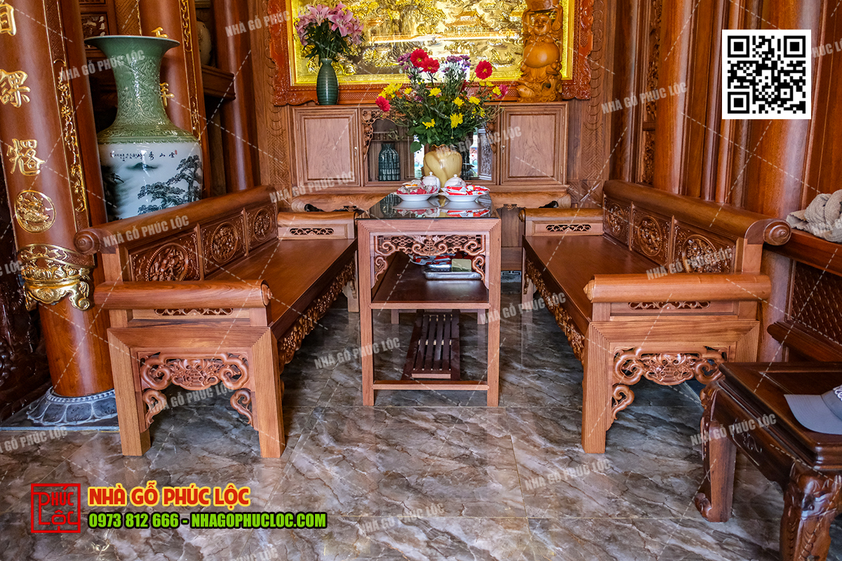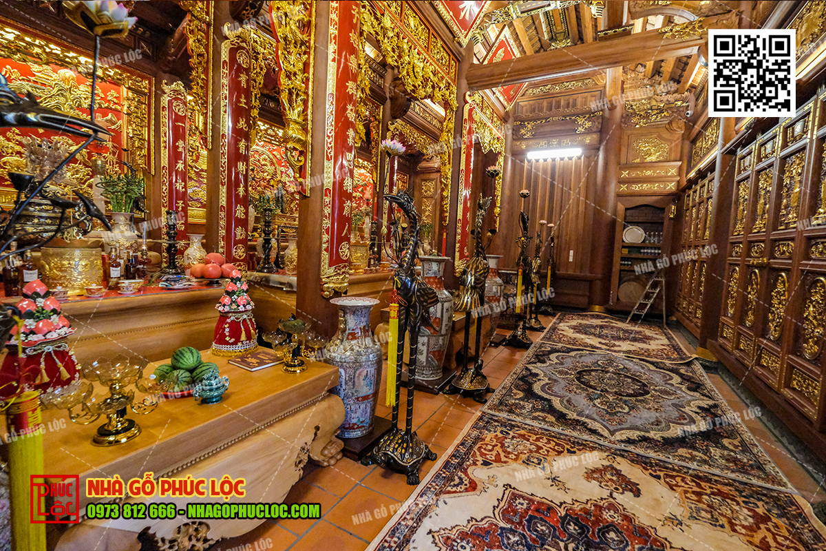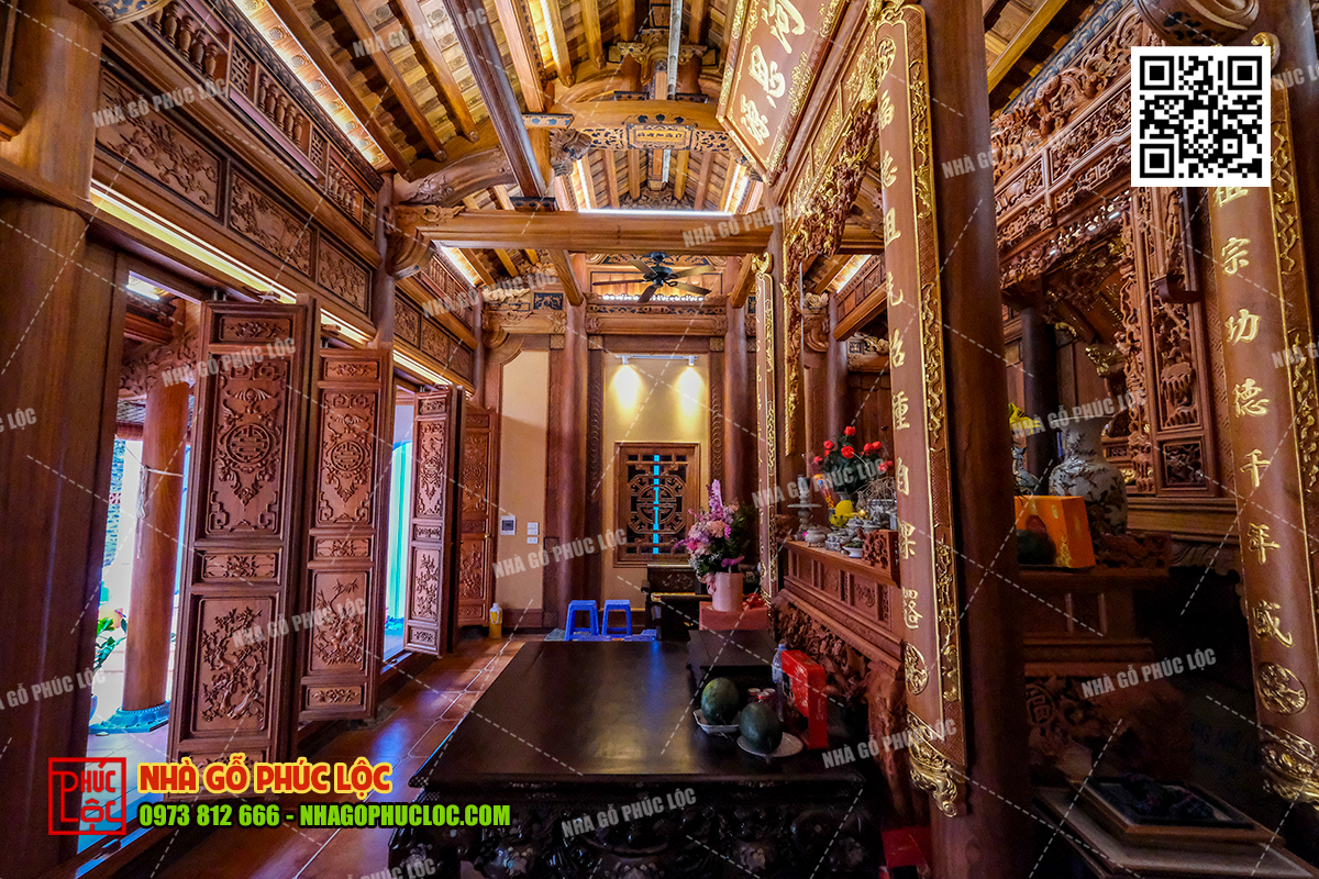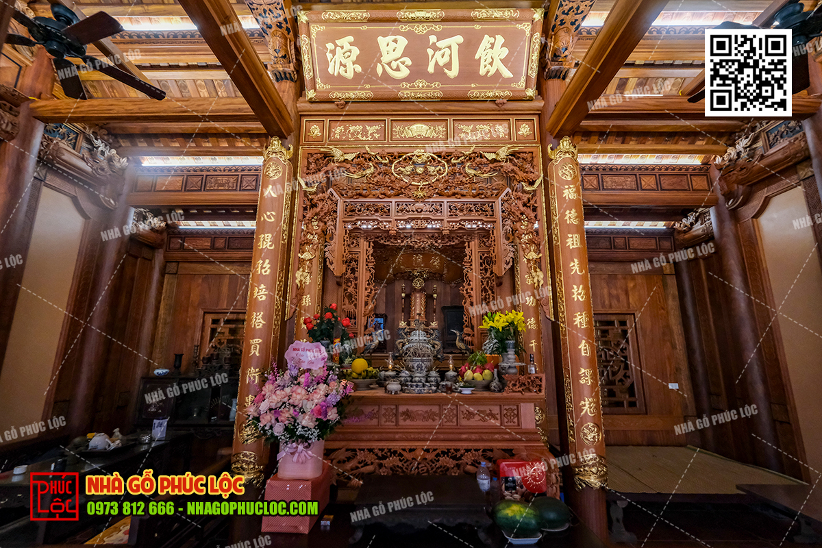 Theo đó, khu vực thờ cúng gia tiên sẽ được bố trí ở gian giữa của nhà gỗ 3 gian. Đây là không gian trang trọng nhất, thể hiện lòng tôn kính và sự hiếu thảo của con cháu đối với tổ tiên. Trong không gian này, có bố trí cửa võng, cuốn thư, câu đối, án gian. Ngoài ra, nội thất nhà gỗ 3 gian có thể thêm các vật phẩm như: lộc bình, hạc chầu đỉnh đồng,… tùy thuộc vào mong muốn của gia chủ..
